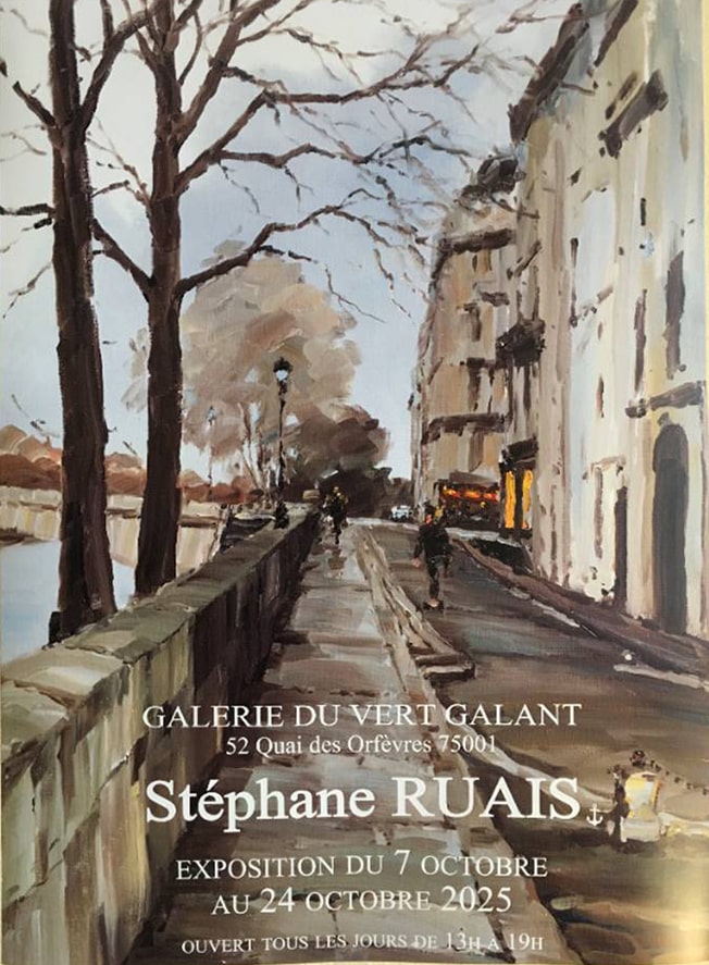 Stéphane Ruais a le plaisir de vous inviter à découvrir sa prochaine exposition qui se déroulera du 7 au 24 octobre 2025 à la galerie du Vert Galant à Paris au 52, Quai des Orfèvres – 75001 Paris. Expositions individuelles.