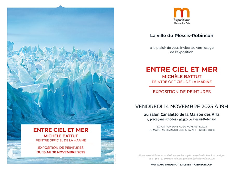 Michèle Battut à la plaisir de vous inviter à découvrir son exposition qui se déroulera du 15 au 30 novembre 2025 au salon Canaletto de la Maison des Arts, 1 place Jane-Rhodes, 92350 Le Plessis-Robinson. Le vernissage aura lieu le vendredi 14 novembre 2025 à 19h00. Expositions individuelles.