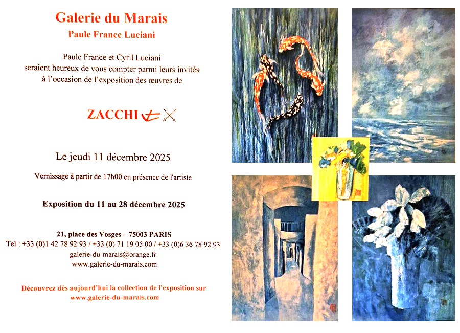 Jean-Marie Zacchi a le plaisir de vous inviter à découvrir sa prochaine exposition qui se tiendra du 11 au 28 décembre 2025 à la galerie du marais, 21 place des Vosges à Paris. Le vernissage aura lieu le jeudi 11 décembre 2025 à partir de 17h00. Expositions individuelles.